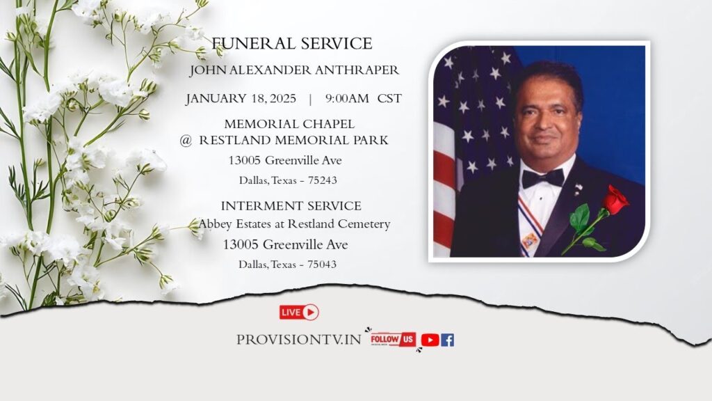 ഡാളസ്: 2024 ഡിസംബർ 24ന് ടെക്സസിലെ ഗ്രേപ്പ്‌വൈനിൽ  അന്തരിച്ച വ്യവസായ പ്രമുഖനും ചാരിറ്റി പ്രവർത്തകനുമായ ജോൺ അലക്സാണ്ടർ അന്ത്രാപെറുടെ ഡിസംബർ 10 ,11 തീയതികളിൽ നിശ്ചയിച്ചിരുന്ന പൊതുദര്ശനവും ശവസംസ്കാര ശുശ്രൂഷയും 2025 ജനുവരി 17 വെള്ളിയാഴ്ച, 18 ശനിയാഴ്ച ദിവസങ്ങളിലേക്കു മാറ്റി.