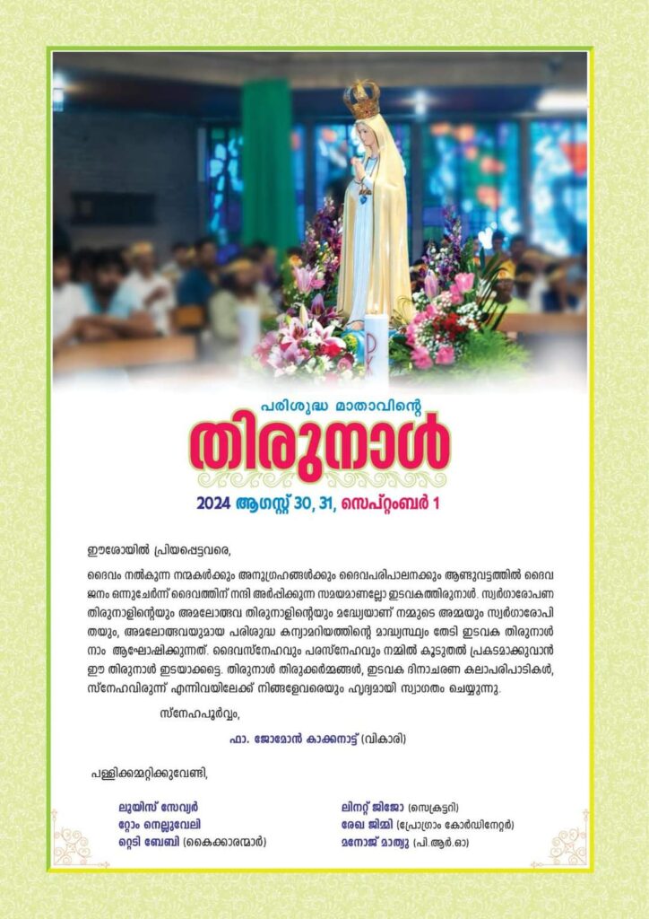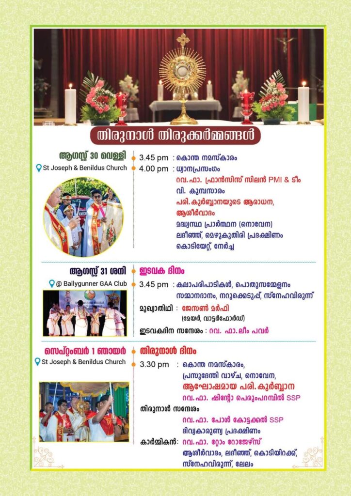തിരുനാളിനോടനുബന്ധിച്ചു കഴിഞ്ഞ ഒൻപതു ഞാറാഴ്ചകളിലായി കുടുംബ കൂട്ടായ്മകളുടെ നേതൃത്വത്തിൽ മാതാവിന്റെ ജപമാലയും പ്രത്യേക മധ്യസ്ഥ പ്രാർത്ഥയും ആചരിച്ചുവരുന്നു. തുടർന്ന് ആഗസ്റ്റ് 30-ന് ഫാ. ഫ്രാൻസിസ് സിലൻ PMI & ടീം നയിക്കുന്ന വാർഷിക ധ്യാനവും കുമ്പസാരവും നടത്തപ്പെടുന്നു. തുടർന്ന് പരിശുദ്ധ കുർബാനയുടെ ആരാധന, നൊവേന, ലദീഞ്ഞ്, മെഴുകുതിരി പ്രദക്ഷിണം, തിരുനാൾ കൊടിയേറ്റ് നേർച്ച. ആഗസ്റ്റ് 31 ശനിയാഴ്ച ഇടവക ദിനാഘോഷം, പൊതുസമ്മേളനം, (മുഖ്യാതിഥി Cllr ജേസൺ മർഫി, മേയർ വാട്ടർഫോർഡ്), കലാസന്ധ്യ, സ്നേഹവിരുന്ന്. സെപ്റ്റംബർ 01 ഞായറാഴ്ച പ്രധാന തിരുനാൾ ദിനം ജപമാല, പ്രസുദേന്തി വാഴ്ച, ആഘോഷമായ തിരുനാൾ കുർബാന (ഫാ. ഷിന്റോ പെരുമ്പറമ്പിൽ SSP), തിരുനാൾ സന്ദേശം റവ. ഫാ. പോൾ കോട്ടക്കൽ SSP, തുടർന്ന് ഫാ. ടോം റോജേർസ് നയിക്കുന്ന ദിവ്യകാരുണ്യ പ്രദക്ഷിണം, ആശീർവാദം, ലദീഞ്ഞു, കൊടിയിറക്ക്, സ്നേഹവിരുന്ന്, ലേലം. എല്ലാവരും ഈ ദിവസങ്ങളിൽ പ്രാർത്ഥനാപൂർവം പങ്കെടുക്കണമെന്ന് ഇടവക വികാരി ഫാ. ജോമോൻ കാക്കനാട്ട് അറിയിച്ചു. കൈക്കാരന്മാർ : ലൂയിസ് സേവ്യർ, ടോം നെല്ലുവേലി, ടെഡി ബേബി. സെക്രട്ടറി: ലിനറ്റ് ജിജോ. പ്രോഗ്രാം കോർഡിനേറ്റർ: രേഖ ജിമ്മി. പി.ആർ.ഓ: മനോജ് മാത്യു, പാരീഷ് കൗൺസിൽ അഗങ്ങൾ എന്നിവർ പരിപാടികൾക്ക് നേതൃത്വം നൽകും.”
