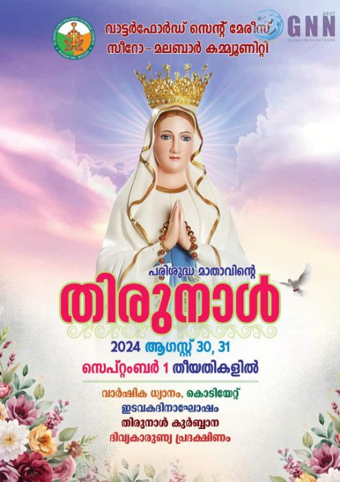 “വാട്ടർഫോർഡ് സെന്റ് മേരീസ് സീറോ മലബാർ കമ്മ്യൂണിറ്റിയുടെ നേതൃത്വത്തിൽ പരി. മാതാവിന്റെ തിരുനാൾ ആഗസ്റ്റ് 30, 31, സെപ്റ്റംബർ 01 തീയതികളിൽ സമുചിതമായി ആഘോഷിക്കുന്നു.