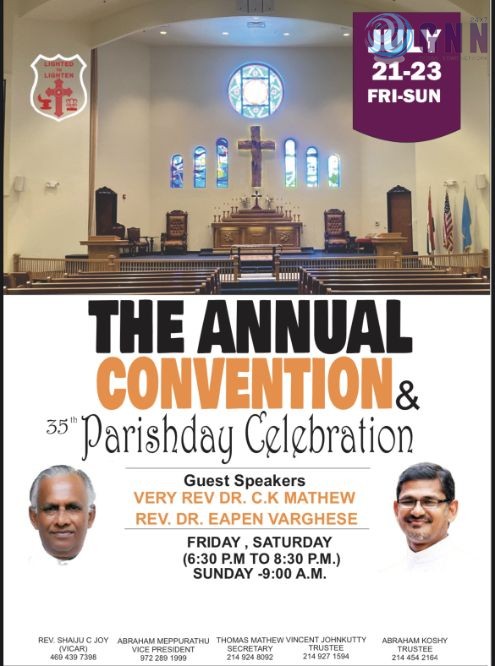 മസ്കറ്റ് ( ഡാളസ്): ഡാലസ് സെൻറ് പോൾസ് മാർത്തോമാ ചർച് ഇടവകദിനാഘോഷവും വാർഷിക കൺവെൻഷനും ജൂലൈ 21 വെള്ളിയാഴ്ച മുതൽ ഞായറാഴ്ച വരെ മസ്കറ്റ് സെൻറ് പോൾസ് മാർത്തോമാ ചർച്ചിൽ വച്ച് നടത്തപ്പെടുന്നു കൺവെൻഷൻ മുഖ്യ പ്രാസംഗികനായി വെരി റവ ഡോ: സി കെ മാത്യു ,റവ ഡോ ഈപ്പൻ വര്ഗീസ് എന്നിവർ പങ്കെടുക്കും വെള്ളിയാഴ്ച ശനിയാഴ്ചയും രാത്രി 6 30 മുതൽ 8 :30 വരെയും ഞായറാഴ്ച രാവിലെ 9 മണിക്ക് വിശുദ്ധ കുർബാനക്കുശേഷം ഇടവകദിനാഘോഷവും തുടർന്നു കൺവെൻഷന്റെ കടശ്ശി യോഗവും ഉണ്ടായിരിക്കുമെന്ന് റെവ ഷൈജു സി ജോയ്(വികാരി),സെക്രട്ടറി തോമസ് മാത്യു എന്നിവർ അറിയിച്ചു. എല്ലാവരെയും സ്വാഗതം ചെയ്യുന്നതായും സംഘാടകർ അറിയിച്ചു .