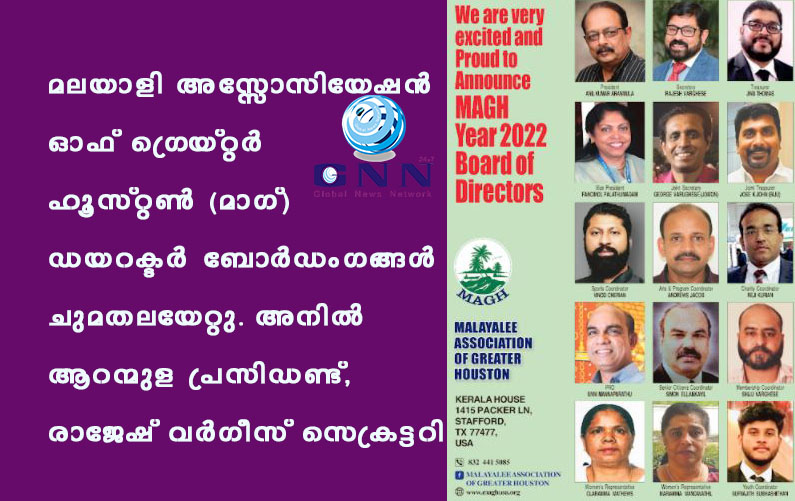 ഹ്യൂസ്റ്റണ്: അമേരിക്കയിലെ ഏറ്റവും വലിയ മലയാളി സംഘടനകളിലൊന്നായ മലയാളി അസോസിയേഷന് ഓഫ് ഗ്രെയ്റ്റര് ഹൂസ്റ്റന്റെ (മാഗ്) 2022 ലെ ഡയറക്ടര് ബോര്ഡ് അംഗങ്ങൾ ചുമതലയേറ്റു.