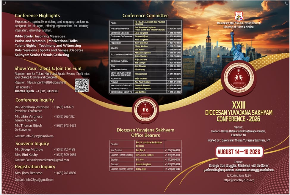ന്യൂയോർക്ക് : ഇരുപത്തിമൂന്നാമത് നോർത്ത് അമേരിക്ക ഭദ്രാസന മർത്തോമ്മാ യുവജന സഖ്യം കോൺഫ്രൻസ് ആഗസ്റ്റ് 14 മുതൽ 16 വരെ ന്യൂയോർക്കിലെ എല്ലെൻവിൽ ഹോണേഴ്സ് ഹെവൻ റിസോർട്ടിൽ വെച്ച് നടത്തപ്പെടുന്നു. ന്യൂയോർക്ക് ശാലേം മാർത്തോമ യുവജന സഖ്യത്തിന്റെ ആഭിമുഖ്യത്തിൽ നടത്തപ്പെടുന്ന ഈ കോൺഫ്രൻസിന്റെ രജിസ്ട്രേഷൻ ആരംഭിച്ചിരിക്കുന്നു.