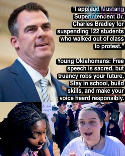 വിദ്യാർത്ഥികളെ സസ്പെൻഡ് ചെയ്ത സ്കൂൾ സൂപ്രണ്ടിന്റെ നടപടിയെ ഒക്ലഹോമ ഗവർണർ കെവിൻ സ്റ്റിറ്റ് പ്രശംസിച്ചു. അഭിപ്രായ സ്വാതന്ത്ര്യം പാവനമാണെങ്കിലും പഠനം ഉപേക്ഷിച്ചുള്ള പ്രതിഷേധം ശരിയല്ലെന്ന് ബുധനാഴ്ച അദ്ദേഹം എക്സിൽ കുറിച്ചു.
