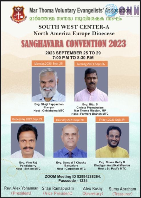 ഡാളസ്: നോർത്ത് അമേരിക്ക-യൂറോപ്പ് മാർത്തോമാ ഭദ്രാസനത്തിന്റ വോളണ്ടറി ഇവാഞ്ചലിസ്റ്റ്സ് അസോസിയേഷൻ സൗത്ത് വെസ്റ്റ് സെന്റർ- A “സംഘവാര കൺവെൻഷൻ” സെപ്റ്റംബർ 25 മുതൽ ആരംഭിക്കുന്നു. മലങ്കര മാർത്തോമ്മാ സുറിയാനി സഭ ഒക്ടോബർ 1 മിഷൻ ഞായറാഴ്ചയായി എല്ലാ വർഷവും ആഘോഷിച്ചു വരുന്നു. ഈ വർഷം മാർത്തോമ്മാ വോളണ്ടറി ഇവാഞ്ചലിസ്റ്റ്സ് അസോസിയേഷൻ (MTVEA) ശതാബ്ദി വർഷമായി കൊണ്ടാടുവാൻ തീരുമാനിച്ചിരിക്കുന്നു. അതിൻറെ ഭാഗമായി നോർത്ത് അമേരിക്ക-യൂറോപ്പ് മാർത്തോമാ ഭദ്രാസനത്തിന്റ വോളണ്ടറി ഇവാഞ്ചലിസ്റ്റ്സ് അസോസിയേഷൻ സൗത്ത് വെസ്റ്റ് സെന്റർ- A സെപ്റ്റംബർ 25 മുതൽ 29 വരെ (രാത്രി 7:0 0 pm – 8:30pm CST) ‘സംഘവാര കൺവെൻഷൻ ആഴ്ചയായി’ നടത്തപ്പെടുന്നു .