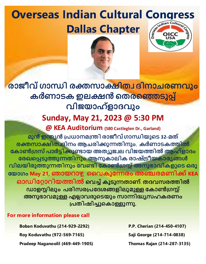 ഡാളസ് :മുൻ ഇന്ത്യൻ പ്രധാനമന്ത്രി രാജീവ് ഗാന്ധിയുടെ 32-മത് രക്തസാക്ഷിത്വദിനം ആചരിക്കുന്നതിനും, കർണാടകത്തിൽ കോൺഗ്രസ് പാർട്ടിക്കുണ്ടായ അത്യുജ്വല വിജയത്തിൽ ആഹ്ളാദം രേഖപ്പെടുത്തുന്നതിനും, ആനുകാലിക രാഷ്ട്രീയകാര്യങ്ങൾ വിലയിരുത്തുന്നതിനും ഓവർസീസ് ഇന്ത്യൻ കൾച്ചറൽ കോൺഗ്രസ് .പ്രത്യേക യോഗം സംഘടിപ്പിക്കുന്നു.