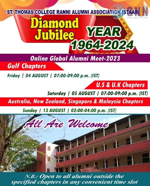 ഹൂസ്റ്റൺ:  2024 ജൂലൈയിൽ നടത്തപ്പെടുന്ന റാന്നി സെന്റ് തോമസ് കോളേജിന്റെ വജ്ര ജൂബിലി ആഘോഷത്തിന് മുന്നോടിയായി കോളേജിലെ പൂർവ്വ വിദ്യാർത്ഥികളുടെ ഗ്ലോബൽ അലുമിനി സൂം മീറ്റിംഗുകൾ സംഘടിപ്പിക്കുന്നു.
