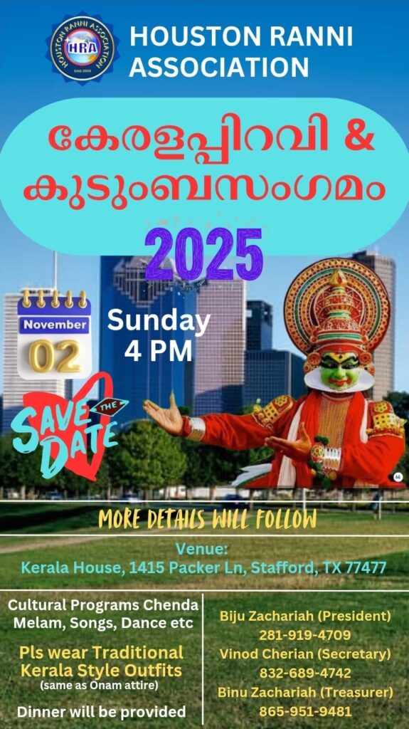 റാന്നി അസോസിയേഷൻ ഹൂസ്റ്റണിൽ കേരളപ്പിറവി വിപുലമായി ആഘോഷിക്കുന്നു