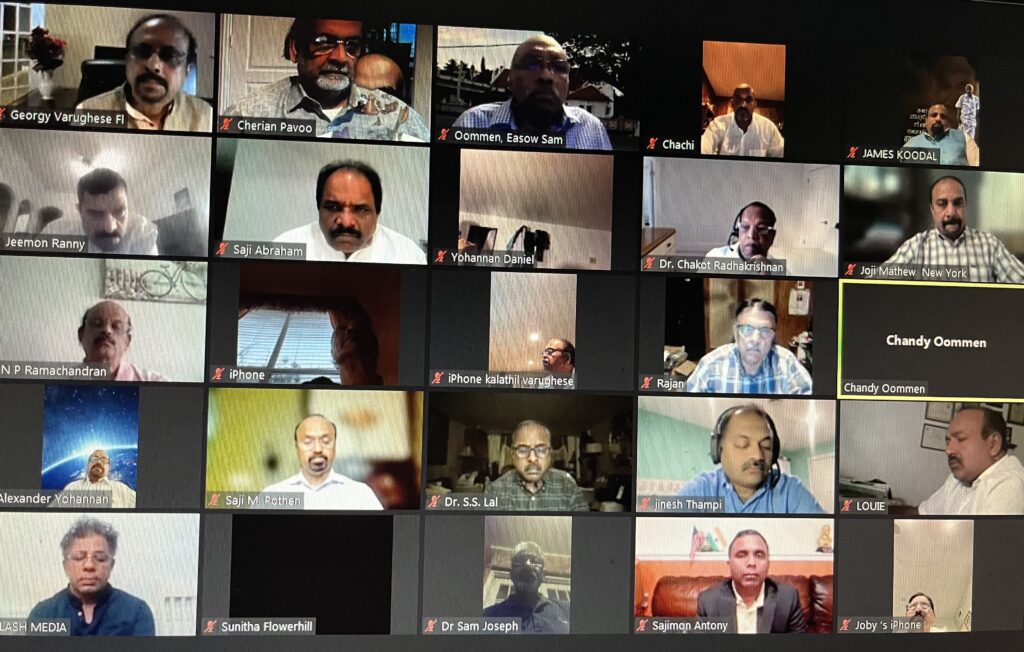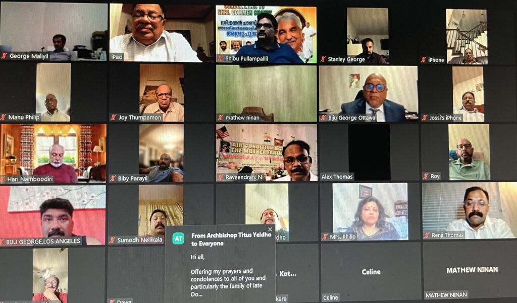 ജൂലൈ 30ന് ഞായറാഴ്ച രാത്രി 9 മണിക്ക് (ന്യൂയോർക്ക് സമയം) സൂം പ്ലാറ്റഫോമിൽ സംഘടിപ്പിച്ച ചടങ്ങിൽ നിശബ്ദ പ്രാർത്ഥനകുശേഷം ഉമ്മൻ ചാണ്ടിയുടെ ജീവിതത്തെക്കുറിച്ചുള്ള 3 മിനിറ്റ് വീഡിയോ പ്രദർശിപ്പിച്ചു. ശ്രീ. ജീമോൻ റാന്നി (ജനറൽ സെക്രട്ടറി) സ്വാഗത പ്രസംഗം നടത്തി. ശ്രീ. ബേബി മണക്കുന്നേൽ (പ്രസിഡന്റ്) അദ്യക്ഷ പ്രസംഗം നടത്തി. ജെയിംസ് കൂടൽ (ഒഐസിസി ചെയർമാൻ) സന്ദേശം നൽകുകയും അനുശോചന പ്രമേയം അവതരിപ്പിക്കുകയും ചെയ്തു.