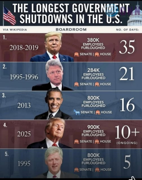 ബിൽ ക്ലിന്റൺ പ്രസിഡന്റായിരുന്നപ്പോൾ 1995-95 ലെ ഷട്ട്ഡൗണിന് ക്ലിന്റണും ഹൗസ് സ്പീക്കർ ന്യൂട്ട് ഗിംഗ്റിച്ചിന്റെ നേതൃത്വത്തിലുള്ള ഡെമോക്രാറ്റുകളും റിപ്പബ്ലിക്കൻമാരും തമ്മിലുള്ള ചെലവിലെ അഭിപ്രായവ്യത്യാസം കാരണമായിരുന്നു അത്. ഇത് തുടർച്ചയായ ഷട്ട്ഡൗണുകളല്ല, മറിച്ച് 1995 നവംബർ 14 മുതൽ 1995 നവംബർ 19 വരെയും പിന്നീട് 1995 ഡിസംബർ 16 മുതൽ 1996 ജനുവരി 6 വരെയും രണ്ട് വ്യത്യസ്ത ഷട്ട്ഡൗണുകളായിരുന്നു.