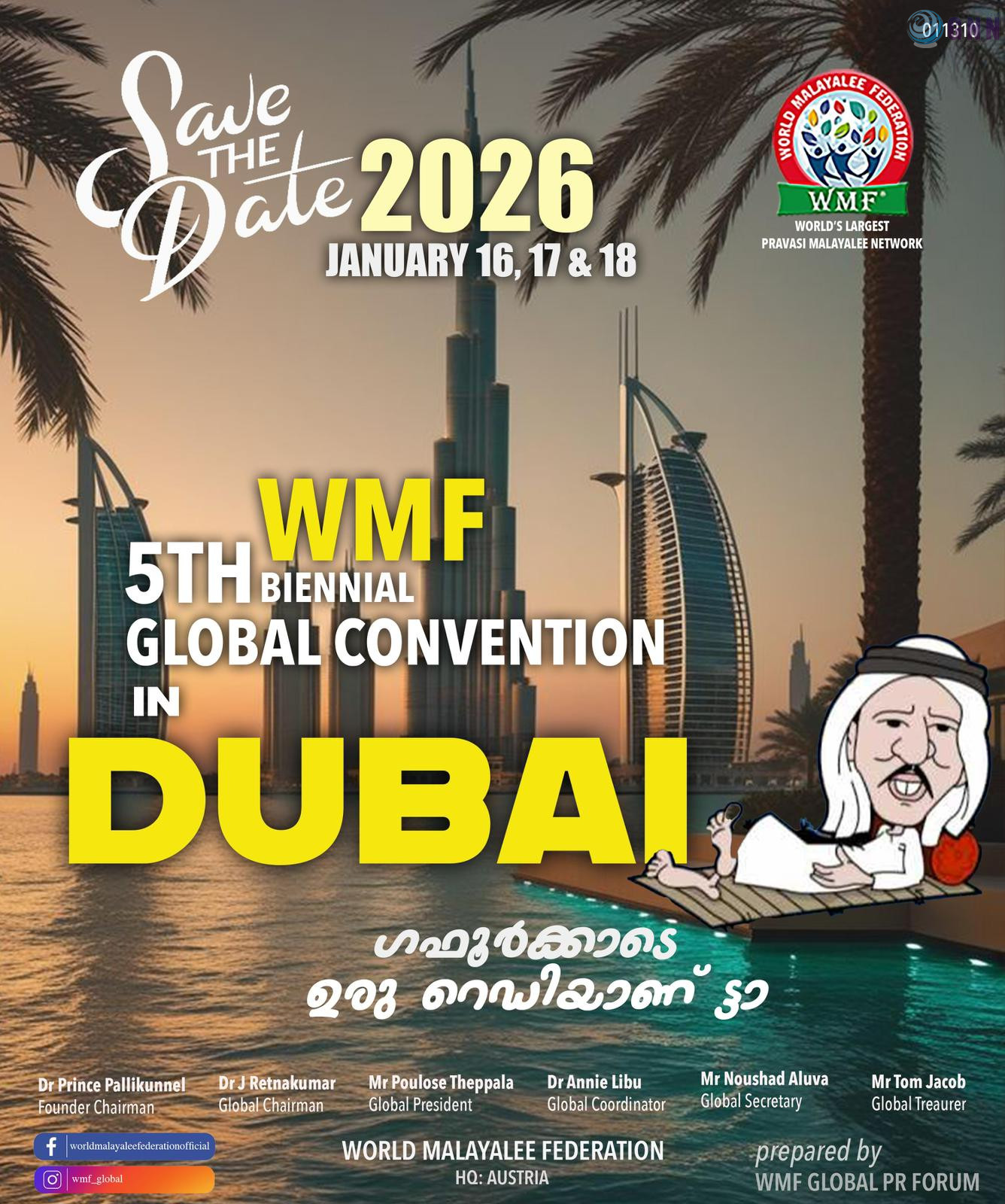 വേൾഡ് മലയാളി ഫെഡറേഷന്റെ (WMF) അഞ്ചാമത് BIENNIAL GLOBAL CONVENTION ദുബായിൽ സംഘടിപ്പിക്കും. 2026 ജനുവരി 16, 17, 18 തീയതികളിലാണ് കൺവെൻഷൻ നടക്കുന്നത്. വേൾഡ് മലയാളി ഫെഡറേഷന്റെ ഗ്ലോബൽ കാബിനറ്റ് യോഗത്തിലാണ്ഏകകണ്ഠമായി തീരുമാനം എടുത്തത്. മിഡിൽ ഈസ്റ്റ് റീജിയണൽ കൗൺസിൽ, യുഎഇ നാഷണൽ കൗൺസിൽ, ദുബായ് സ്റ്റേറ്റ് കൗൺസിൽ എന്നിവിടങ്ങളിലെ കോർ ടീമുമായി ഗ്ലോബൽ ചെയർമാൻ ഡോ. ജെ. രത്‌നകുമാറിന്റെ അധ്യക്ഷതയിൽ സ്ഥാപക ചെയർമാനും ഗ്ലോബൽ പ്രസിഡന്റും പങ്കെടുത്ത യോഗം അടുത്തിടെ നടന്നു. മിഡിൽ ഈസ്റ്റ് മേഖലയിലെ എല്ലാ നേതാക്കളും യോഗ തീരുമാനത്തെ അംഗീകരിക്കുകയും പരിപാടി വൻ വിജയമാക്കുന്നതിന് പൂർണ്ണ പിന്തുണ വാഗ്ദാനം ചെയ്യുകയും ചെയ്തു.