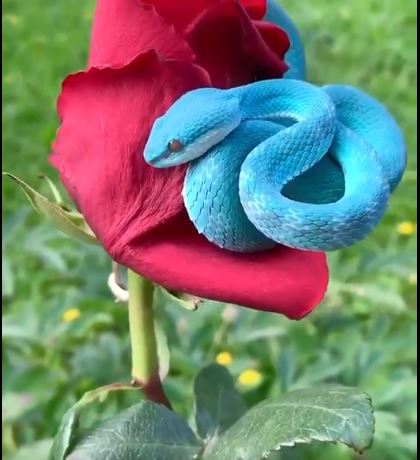 ചുവന്ന റോസാ പുഷ്പം ഇഷ്ടമല്ലാത്തവർ ആരുമുണ്ടാകില്ല. റോസായുടെ നനുത്ത ഇതളുകളിൽ മുഖം അമർത്തി സൗന്ദര്യം നുകരുന്നത് ഒരു പാമ്പാണെങ്കിലോ? അതും ആകർഷകമായ നീല നിറത്തിലുള്ള പാമ്പ്. ചുവന്ന റോസായിൽ ചുറ്റിവിരിഞ്ഞ് കിടക്കുകയാണ് നീല വർണത്തിലുള്ള ഒരു കുഞ്ഞൻ പാമ്പ്.