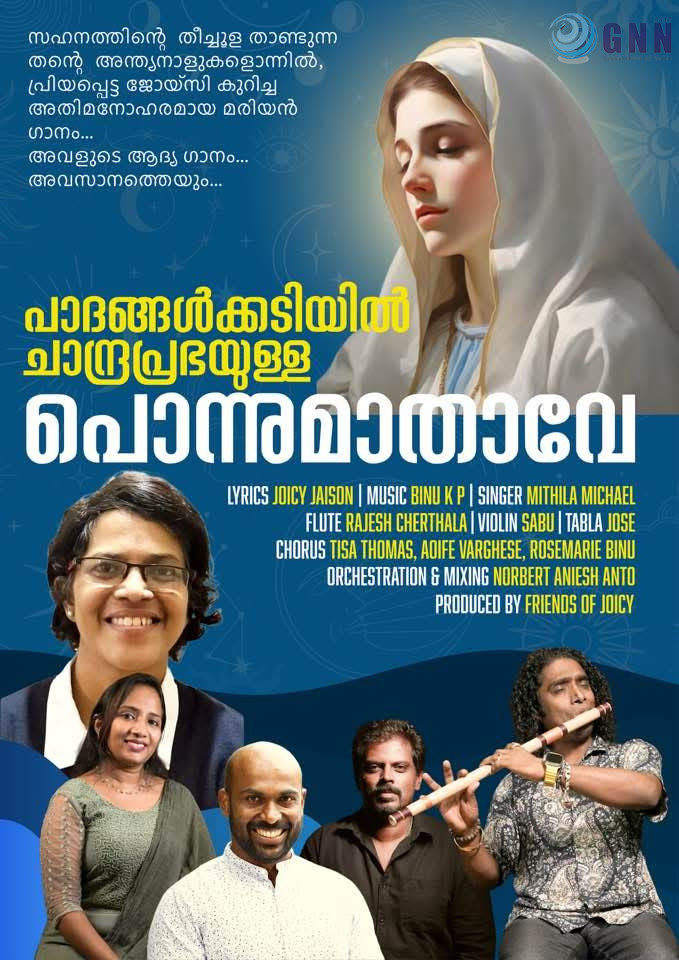 മരണമുഖത്തും പുഞ്ചിരി. ആയാത്ത പ്രിയ സുഹൃത്തിന്റെ സ്വപ്നം യാഥാർഥ്യമാക്കി കൂട്ടുക്കാർ.മാതാവിനോടുള്ള സ്നേഹവും അതിലേറെ തിരുവചനത്തോടുള്ള ആഴത്തിലുള്ള അടുപ്പവും തുളുമ്പുന്ന വരികൾ എഴുതിയ ജോയ്സി ഇന്ന് തിരുസന്നിധിയിൽ സന്തോഷിക്കുന്നുണ്ടെന്ന് അവരുടെ കൂട്ടുകാർക്ക് അറിയാം. തന്റെ അവസാന നാളുകളിൽ ഭക്തിപൂർവ്വം ജോയ്സി എഴുതിയ മരിയൻ ഗാനം ‘പാദങ്ങൾക്കടിയിചാന്ദ്രപ്രഭയുള്ള പൊന്നുമാതാവേ’ ഏപ്രിൽ 5ന് പുറത്തിറങ്ങും. ജോലിസിയുടെ വരികൾക്ക് സുഹൃത്ത് ബിനു കെ പി ഈണം പകർന്നിരിക്കുന്നു. മിതില മൈക്കിൾ ഗാനം ആലപിച്ചിരിക്കുന്നു. ജോയ്സിയുടെ സുഹൃത്തുക്കൾ തന്നെയാണ് ആൽബം നിർമ്മിച്ചിരിക്കുന്നത്.