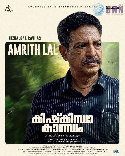 ഗുഡ് വിൽ എൻ്റെർടൈൻമെൻ്റിൻ്റെ ബാനറിൽ ജോബി ജോർജ് നിർമ്മിച്ച് ദിൽജിത് അയ്യത്താൻ സംവിധാനം ചെയ്യുന്ന കിഷ്ക്കിന്ധാകാണ്ഡം എന്ന ചിത്രത്തിലെ ഏറ്റവും പുതിയ ക്യാരക്ടർർപോസ്റ്റർ പുറത്തുവിട്ടിരിക്കുന്നു. പ്രശസ്ത തമിഴ് നടൻ നിഴൽകൾ രവി അവതരിപ്പിക്കുന്ന അമൃത് ലാൽ എന്ന കഥാ പാത്രത്തിൻ്റെ പോസ്റ്ററാണ് ഇപ്പോൾ പുറത്തുവിട്ടിരിക്കുന്നത്.