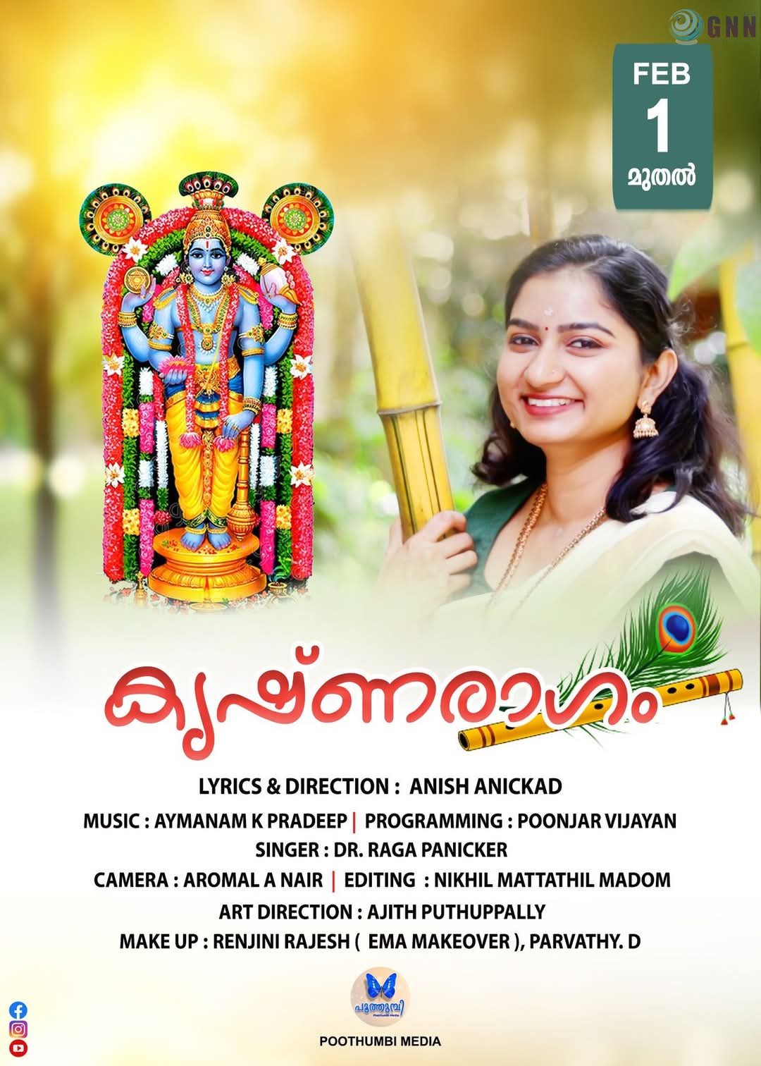 ഭക്തമാനസത്തിൽ കൃഷ്ണ ചൈതന്യം നിറച്ച് പുതിയ ആൽബം ‘കൃഷ്ണരാഗം’.അനീഷ് ആനിക്കാട് രചനയും സംവിധാനവും നിർവഹിച്ച് ഏറ്റവും പുതിയ ഭക്തിഗാനം ‘കൃഷ്ണരാഗം’ ഏറെ ജനപ്രിയമാകുന്നു. അയ്മനം കെ. പ്രദീപ് ചിട്ടപ്പെടുത്തിയ ഗാനം ആലപിച്ചിരിക്കുന്നത് ഡോ. രാഗ പണിക്കർ ആണ്. പൂത്തുമ്പി മീഡിയയുടെ ബാനറിലാണ് ഗാനം റീലിസ് ചെയ്തിരിക്കുന്നത്.