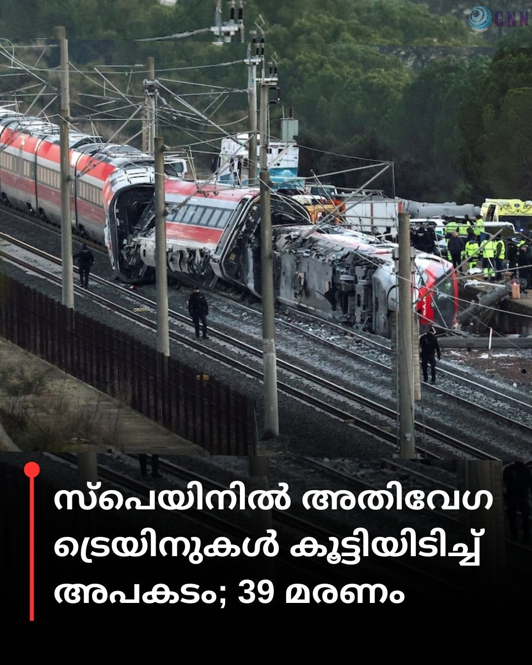 സ്പെയിനിലെ കോർഡോബ പ്രവിശ്യയിൽ രണ്ട് അതിവേഗ ട്രെയിനുകൾ കൂട്ടിയിടിച്ച് 39 പേർ മരിക്കുകയും 73 പേർക്ക് പരിക്കേൽക്കുകയും ചെയ്തു. മലാഗയിൽ നിന്ന് മാഡ്രിഡിലേക്ക് പോവുകയായിരുന്ന ട്രെയിൻ പാളം തെറ്റി എതിർദിശയിൽ വന്ന മറ്റൊരു ട്രെയിനുമായി കൂട്ടിയിടിച്ചാണ് അപകടം. കഴിഞ്ഞ പത്ത് വർഷത്തിനിടെ സ്പെയിൻ കണ്ട ഏറ്റവും വലിയ റെയിൽ അപകടമാണിത്. സംഭവത്തിന് പിന്നാലെ സൈന്യവും റെഡ് ക്രോസും ഉൾപ്പെടെയുള്ള വൻ സന്നാഹം രക്ഷാപ്രവർത്തനത്തിനായി സ്ഥലത്തെത്തിയിട്ടുണ്ട്.