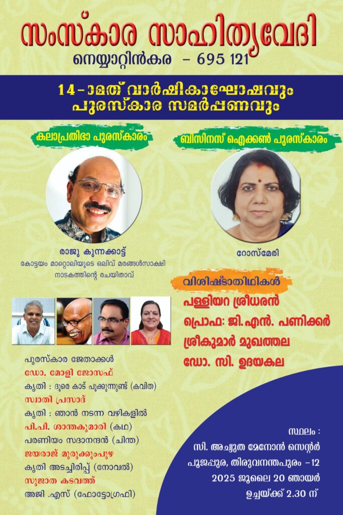 തിരുവനന്തപുരം : സംസ്കാര സാഹിത്യവേദിയുടെ മികച്ച നാടകരചനക്കുള്ള അവാർഡ് രാജു കുന്നക്കാട്ടിന്. കോട്ടയം മാറ്റൊലിയുടെ ജനപ്രിയ നാടകമായ ഒലിവ് മരങ്ങൾ സാക്ഷി എന്ന നാടകമാണ് അവാർഡിന് അർഹമായത്. ഈ നാടകത്തിന്റെ രചനക്ക് ലഭിക്കുന്ന ഏഴാമത്തെ പുരസ്കാരമാണിത്.ഈ നാടകത്തിന്റെ സംവിധായകനും നടനുമായ ബെന്നി ആനിക്കാടിനും, മറ്റൊരു നടനായ മുൻ കാർട്ടൂൺ അക്കാഡമി ചെയർമാൻ പ്രസന്നൻ ആനിക്കാടിനും മുൻപ് അവാർഡ് ലഭിച്ചിരുന്നു.