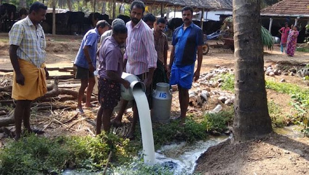 പാലക്കാടും മലബാര് മേഖലയിലും അടക്കം കറന്നെടുത്ത പാല് ഒഴിക്കിക്കളയേണ്ട ഗതികേടിലാണ് കര്ഷകര്. കറന്നെടുത്ത പാല് എവിടെ കൊണ്ടുപോകുമെന്ന് അറിയാതെ പ്രതിസന്ധിയിലായ കര്ഷകരാണ് ഒടുവില് പാല് ഒഴുക്കിക്കളഞ്ഞത്. പാലക്കാട് ചിറ്റൂര് മേഖലയില് മാത്രം ഏകദേശം എണ്പതിനായിരം ലിറ്റര് പാലാണ് ഒഴുക്കിക്കളയേണ്ടി വന്നത്.