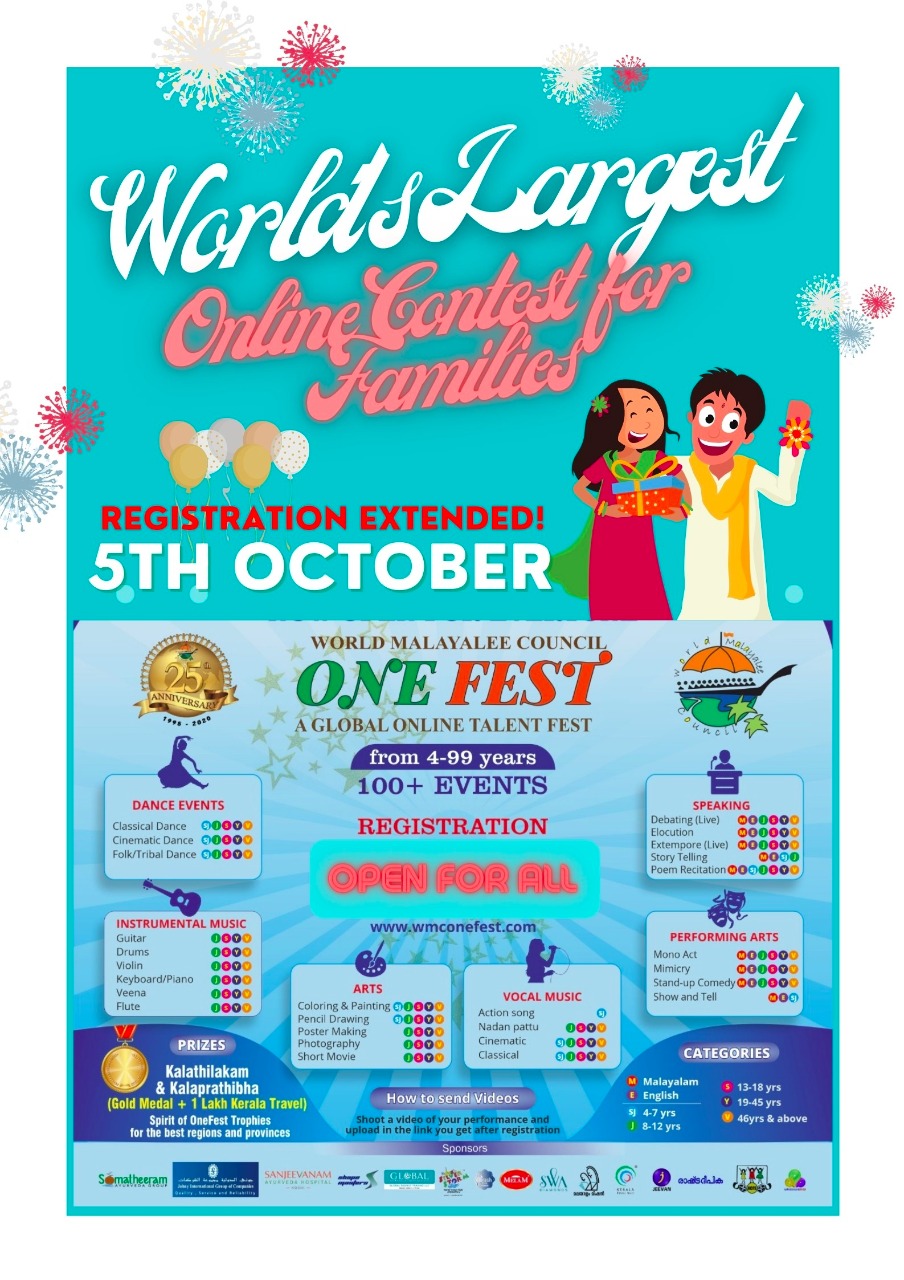 തിരുവനന്തപുരം: വേൾഡ് മലയാളി കൗൺസിൽ ഗ്ലോബൽ യൂത്ത് ഫോറം നടത്തുന്ന ‘വൺ ഫെസ്റ്റ് ‘കലാ മാമാങ്കത്തിന്റെ ഒരുക്കങ്ങൾ അവസാന ഘട്ടത്തിലേക്ക് കടക്കുകയാണ്. വിർച്വൽ ആയി നടത്തപ്പെടുന്ന ലോകത്തിലെ ഏറ്റവും വലിയ ഈ കലാ മാമാങ്കത്തിൽ നാലു വയസിനു മുകളിലുള്ള ഏതു കലാകാരനും കലാകാരിക്കും പങ്കെടുക്കാവുന്ന വിധത്തിലാണ് മത്സരങ്ങൾ ക്രമീകരിച്ചിരിക്കുന്നത്.