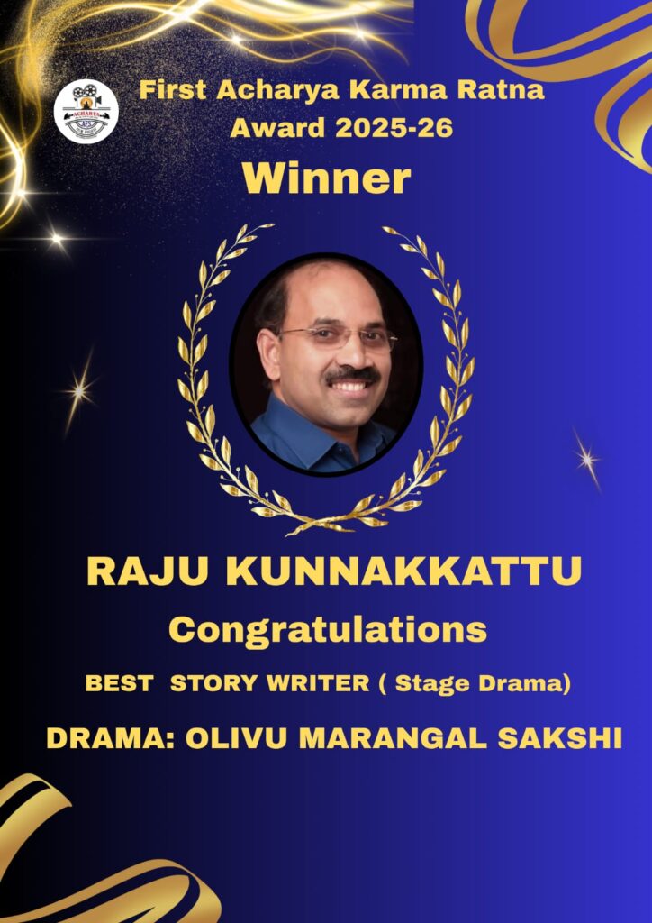 തിരുവനന്തപുരം:ആചാര്യ ഫിലിം സൊസൈറ്റി ഏർപ്പെടുത്തിയ പ്രഥമ ആചാര്യ കർമ്മരത്ന പുരസ്കാരം രാജു കുന്നക്കാട്ടിന്. കോട്ടയം മാറ്റൊലിയുടെ ബൈബിൾ ഡ്രാമാസ്കോപ്പ് നാടകം ഒലിവ് മരങ്ങൾ സാക്ഷിയുടെ രചനക്കാണ് അവാർഡ്.