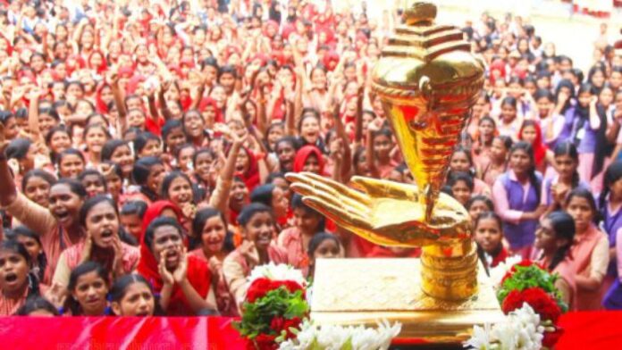 കോഴിക്കോട് : സംസ്ഥാന സ്കൂൾ കലോത്സവത്തിൽ സ്വർണക്കപ്പ് നേടി കോഴിക്കോട്. 938 പോയിന്റ് നേടിയാണ് ആതിഥേയരായ കോഴിക്കോട് കിരീടമുറപ്പിച്ചത്. രണ്ടാം സ്ഥാനത്തിനായി കണ്ണൂരും പാലക്കാടുമായി ശക്തമായ മത്സരമാണ് അവസാന നിമിഷവും നടക്കുന്നത്.കണ്ണൂരിന് 918 ഉം പാലക്കാടിന് 916ഉം പോയിന്റാണ്. പത്താം തവണയും പാലക്കാട് ഗുരുകുലം സ്കൂളിനാണ് ഒന്നാം സ്ഥാനം. 156 പോയിന്റോടെയാണ് ഗുരുകുലം ഒന്നാമതായത്.