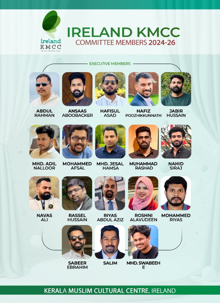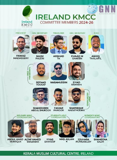 2024 ആഗസ്റ്റ്‌ 24 ശനിയാഴ്ച്ച ചേർന്ന ജനറൽ ബോഡി യോഗം തീരുമാനിച്ച അയർലന്റ്‌ കെ.എം.സി.സി 2024-26 കമ്മിറ്റിയിൽ, ഫവാസ്‌ മാടശ്ശേരി അദ്ധ്യക്ഷനും, നജം പാലേരി ജനറൽ സെക്രട്ടറിയും, അർഷദ്‌ ടി.കെ ട്രഷററുമായി തെരഞ്ഞെടുക്കപ്പെട്ടു.