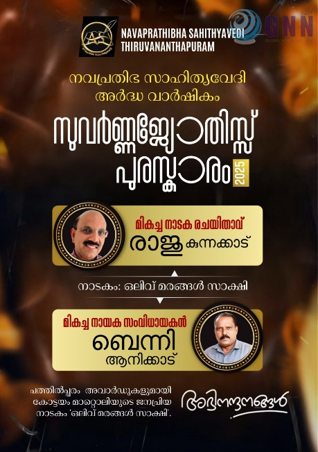 മികച്ച നാടകരചനക്കുള്ള തിരുവനന്തപുരം നവപ്രതിഭ സാഹിത്യവേദിയുടെ സുവർണ്ണ ജ്യോതിസ് അവാര്ഡ് രാജു കുന്നക്കാട്ടിന്. കോട്ടയം മാറ്റൊലിയുടെ ജനപ്രിയ നാടകമായ ഒലിവ് മരങ്ങള് സാക്ഷി എന്ന നാടകമാണ് അവാര്ഡിന് അര്ഹമായത്. ഈ നാടകത്തിന്റെ രചനയ്ക്ക് ലഭിക്കുന്ന എട്ടാമത്തെ പുരസ്കാരമാണിത്.