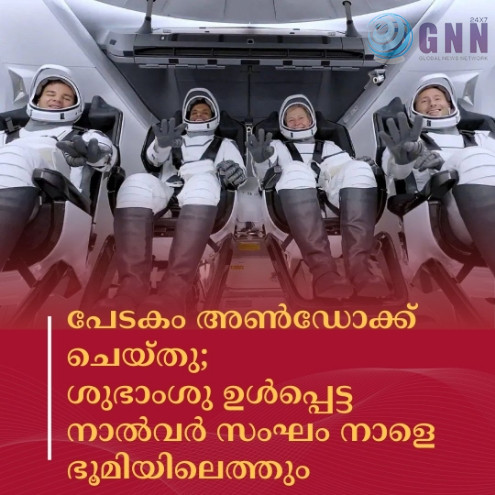 അന്താരാഷ്ട്ര ബഹിരാകാശ നിലയത്തിലെ 18 ദിവസത്തെ വാസത്തിനുശേഷം വ്യോമസേനാ ഗ്രൂപ് ക്യാപ്റ്റൻ ശുഭാംശു ശുക്ല ഉൾപ്പെട്ട നാൽവർ സംഘം ഭൂമിയിലേക്ക്. ഇന്ത്യൻ സമയം വൈകീട്ട് 4.35-ന് ക്രൂ ഡ്രാഗൺ പേടകം അന്താരാഷ്ട്ര ബഹിരാകാശ നിലയത്തിൽനിന്ന് അൺഡോക് ചെയ്തു. ചൊവ്വാഴ്ച വൈകുന്നേരം മൂന്നോടെ പേടകം കാലിഫോർണിയാ തീരത്തിനടുത്ത് ശാന്തസമുദ്രത്തിൽ സ്പ്ലാഷ് ഡൗൺ ചെയ്യും. അതിനുശേഷം യാത്രികരെ പേടകത്തിൽനിന്ന് പുറത്തെത്തിച്ച് ബോട്ടുകളിൽ പുനരധിവാസകേന്ദ്രത്തിലേക്ക് കൊണ്ടുപോകും.