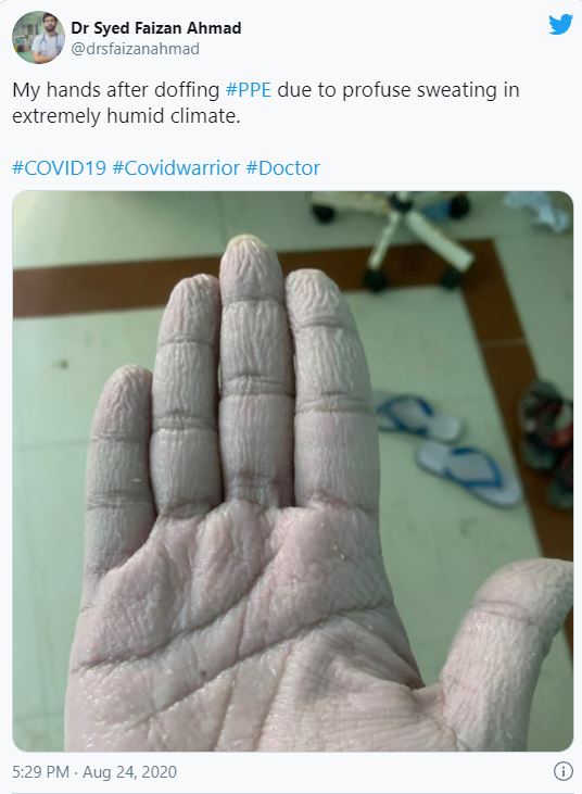 ആരോഗ്യപ്രവർത്തകരെയും മറ്റും ആളുകൾ സോഷ്യൽ മീഡിയയിൽ അഭിനന്ദനങ്ങൾ കൊണ്ടു മൂടുകയാണ്. എന്നാൽ, ഇവർ ഡോക്ടർമാരും നഴ്സുമാരും ഉൾപ്പെടെയുള്ളവർ അനുഭവിക്കുന്ന പല കഷ്ടപ്പാടുകളും അറിയുന്നു പോലുമില്ല. ഇതിനിടയിലാണ് ഉത്തർ പ്രദേശിൽ നിന്നുള്ള സയിദ് ഫയിസാൻ അഹ്മദ് എന്ന ഒരു ഡോക്ടറിന്റെ സോഷ്യൽ മീഡിയ പോസ്റ്റ് വൈറലാകുന്നത്. നീണ്ട പത്തു മണിക്കൂർ നേരം കോവിഡ് വാർഡിൽ ഗ്ലൗസ് ഉൾപ്പെടെയുള്ള സുരക്ഷാ ഉപകരണങ്ങൾ ധരിച്ച് ജോലി ചെയ്തതിനു ശേഷം ഗ്ലൗസ് മാറ്റിയപ്പോൾ തന്റെ കൈ എങ്ങനെയാണെന്ന് കാണിച്ചു തരികയാണ് ഫോട്ടോയിൽ ഡോക്ടർ. നിരവധി പേരാണ് ഡോക്ടറെ അഭിനന്ദിച്ച് രംഗത്തെത്തിയത്. എന്നാൽ, ഗ്ലൗസ് ധരിക്കുന്നത് ഏറ്റവും ചെറിയ പ്രശ്നങ്ങളിൽ ഒന്നാണെന്ന് ഡോക്ടർ പറഞ്ഞു.
