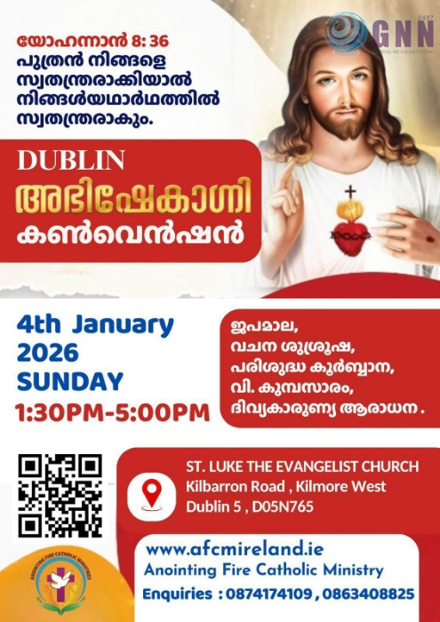 കഴിഞ്ഞ രണ്ട് ദശാബ്ദങ്ങളായി കേരള കത്തോലിക്ക സഭയിൽ ആത്മീയ ഉണർവിന് കാരണമായി ദൈവം ഉയർത്തിയ അഭിഷേകാഗ്നി വചന ശുശ്രൂഷ 2026 ജനുവരി നാലാം തീയതി ഡബ്ലിനിലെ ബൂമൌണ്ടിൽ വെച്ചു നടത്തപ്പെടുന്നു. ഡബ്ലിൻ 5-ലെ സെന്റ് ലൂക്ക് ദേവാലയത്തിൽ 1:30 pm മുതൽ 5:00 pm വരെയാണ് ശുശ്രൂഷ ക്രമീകരിച്ചിരിക്കുന്നത്.