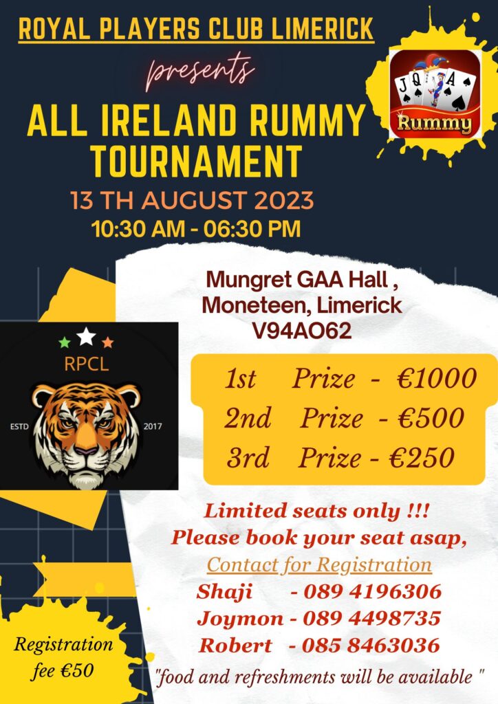 ROYAL PLAYERS CLUB LIMERICK സംഘടിപ്പിക്കുന്ന ALL IRELAND RUMMY TOURNAMENT ആഗസ്റ്റ് 13ന് നടക്കും. Mungret GAA Hall, Moneteen, Limerick ൽ വച്ചാണ് ടൂർണമെന്റ് നടക്കുക.