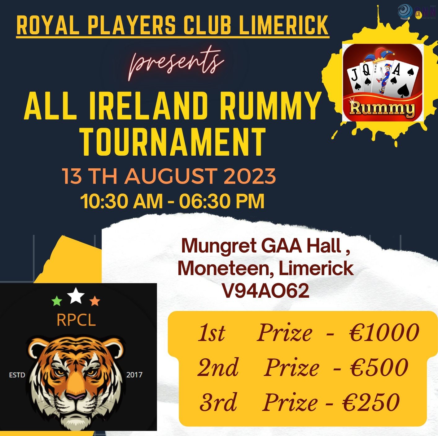 ROYAL PLAYERS CLUB LIMERICK സംഘടിപ്പിക്കുന്ന ALL IRELAND RUMMY TOURNAMENT ആഗസ്റ്റ് 13ന് നടക്കും. Mungret GAA Hall, Moneteen, Limerick ൽ വച്ചാണ് ടൂർണമെന്റ് നടക്കുക.