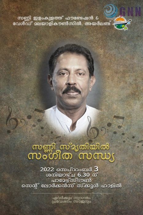 ഡബ്ലിൻ : വേൾഡ് മലയാളി കൗൺസിൽ അയർലണ്ട് പ്രോവിൻസ് ട്രഷററും, സാമൂഹ്യ സാംസ്കാരിക രംഗത്ത് അയർലണ്ട് മലയാളികളുടെ ഇടയിലെ നിറ സാന്നിധ്യവുമായിരുന്ന സണ്ണി ഇളംകുളത്ത് ഓർമ്മയായായിട്ട് ആഗസ്റ്റ് 31 ന് അഞ്ചുവർഷമാകുകയാണ്.ഇതോടനുബന്ധിച്ച് വേൾഡ് മലയാളി കൗൺസിൽ അയർലണ്ട് പ്രോവിൻസിന്റെയും, സണ്ണി ഇളംകുളത്ത് ഫൌണ്ടേഷന്റെയും ആഭിമുഖ്യത്തിൽ സെപ്റ്റംബർ 3 ശനിയാഴ്ച വൈകിട്ട് 6 മുതൽ 8.30 വരെ പാമേർസ് ടൌൺ സെന്റ് ലോർക്കൻസ് സ്കൂൾ ഹാളിൽ വച്ച് അനുസ്മരണവും ഗാനസന്ധ്യയും നടത്തപ്പെടുന്നതാണ്.ഏവരെയും സ്വാഗതം ചെയ്യുന്നതായി സംഘാടകർ അറിയിച്ചു.