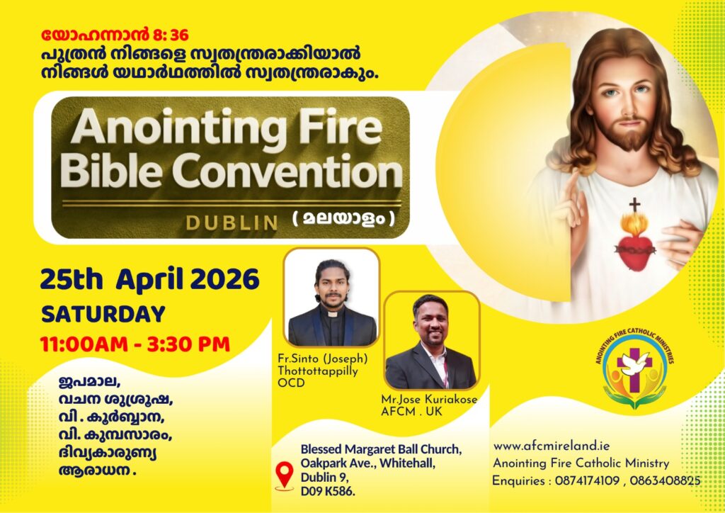Anointing Fire bible Convention ( MALAYALAM), ഏപ്രിൽ-25 ശനിയാഴ്ച ഡബ്ലിൻ ബ്യൂമൗണ്ടിലെ Blessed Margaret Ball ദേവാലയത്തിൽ 11 :00 am മുതൽ 3:30 pm വരെ നടത്തപ്പെടുന്നു .