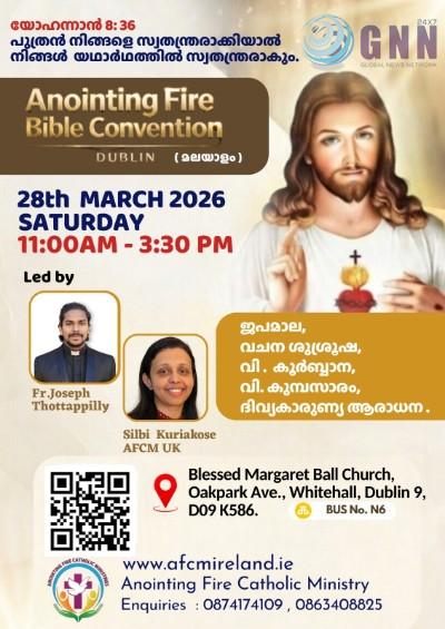 ഡബ്ലിൻ: Anointing Fire Catholic Ministry (AFCM) സംഘടിപ്പിക്കുന്ന മലയാളം Bible Convention മാർച്ച് 28-ാം തീയതി ശനിയാഴ്ച ഡബ്ലിൻ ബ്യൂമോണ്ടിലെ Blessed Margaret Ball ദേവാലയത്തിൽ 11 :00 am മുതൽ 3:30 pm വരെ നടത്തപ്പെടുന്നു. അയർലണ്ടിലെ കേരളത്തിൽ നിന്നുള്ള വൈദികരോടൊപ്പം യുകെയിലെയും അയർലണ്ടിലെയും AFCM ശുശ്രൂഷകർ നേതൃത്വം നൽകുന്ന ഈ ശുശ്രൂഷ മലയാളത്തിലാണ് ക്രമീകരിച്ചിരിക്കുന്നത്.