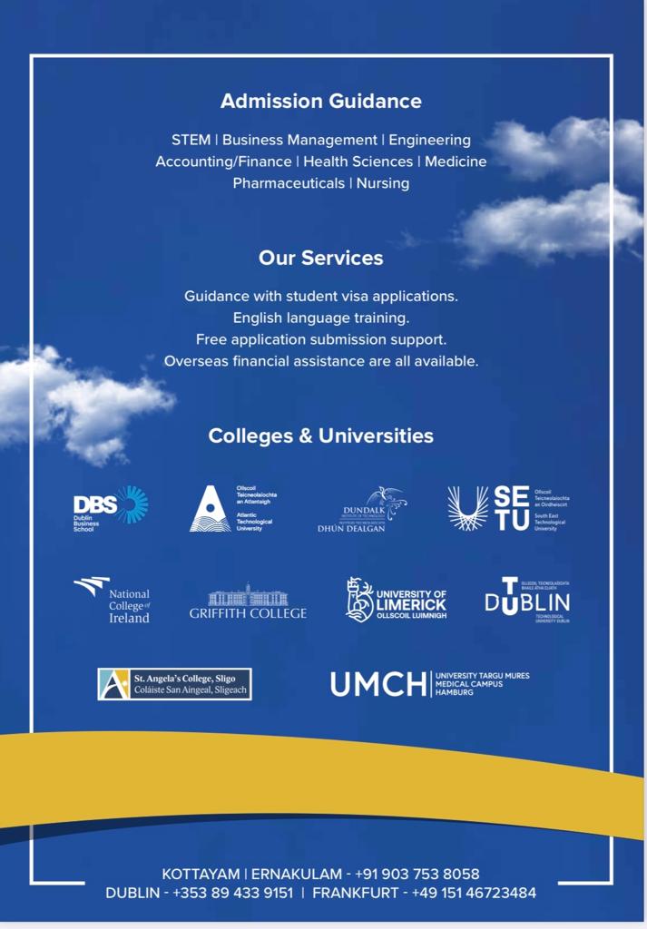വിദേശ പഠനവും ജോലിയും ആഗ്രഹിക്കുന്നവരാണോ നിങ്ങൾ? എങ്കിൽ മറ്റാർക്കും നൽക്കാൻ കഴിയാത്ത അവസരം നിങ്ങൾക്കായി ഒരുക്കുകയാണ് JUST RIGHT OVERSEAS STUDIES Limited. അയർലണ്ടിന് പുറമെ ജർമ്മനിയിലേക്കുള്ള 2023 ഇൻടേക്കിലേക്ക് അഡ്മിഷൻ ആരംഭിച്ചു. നിങ്ങളെ കാത്തിരിക്കുന്ന അവസരങ്ങലെ കുറിച്ച് അറിയാം.