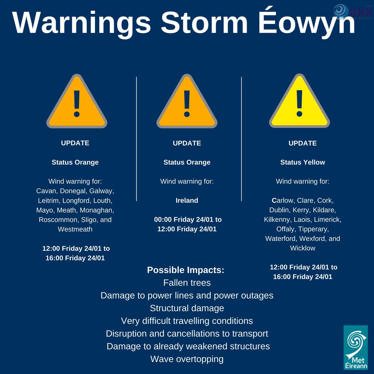 കാവൻ , ഡൊണെഗൽ , മോണഗാൻ , കൊണാച്ച് , ലോംഗ്ഫോർഡ് , ലൗത്ത് , മീത്ത് , വെസ്റ്റ്മീത്ത് എന്നിവിടങ്ങളിൽ ഓറഞ്ച് മുന്നറിയിപ്പ് ഉച്ചയ്ക്ക് 12 മണി മുതൽ പ്രാബല്യത്തിൽ വരികയും വൈകുന്നേരം 4 മണി വരെ തുടരുകയും ചെയ്യും. കാർലോ , ഡബ്ലിൻ , കിൽഡെയർ , കിൽകെന്നി , ലാവോയിസ് , ഒഫാലി , വെക്സ്ഫോർഡ് , വിക്ലോ , മൺസ്റ്റർ എന്നീ കൗണ്ടികളിൽ ഉച്ചയ്ക്ക് 12 മുതൽ വൈകിട്ട് 4 വരെ സ്റ്റാറ്റസ് യെല്ലോ കാറ്റ് മുന്നറിയിപ്പ് ഉണ്ടായിരിക്കും.വൈകുന്നേരം 4 മണി മുതൽ രാത്രി 11 മണി വരെ ഡൊണഗലിൽ മഞ്ഞ കാറ്റ് മുന്നറിയിപ്പ് ബാധകമായിരിക്കും.