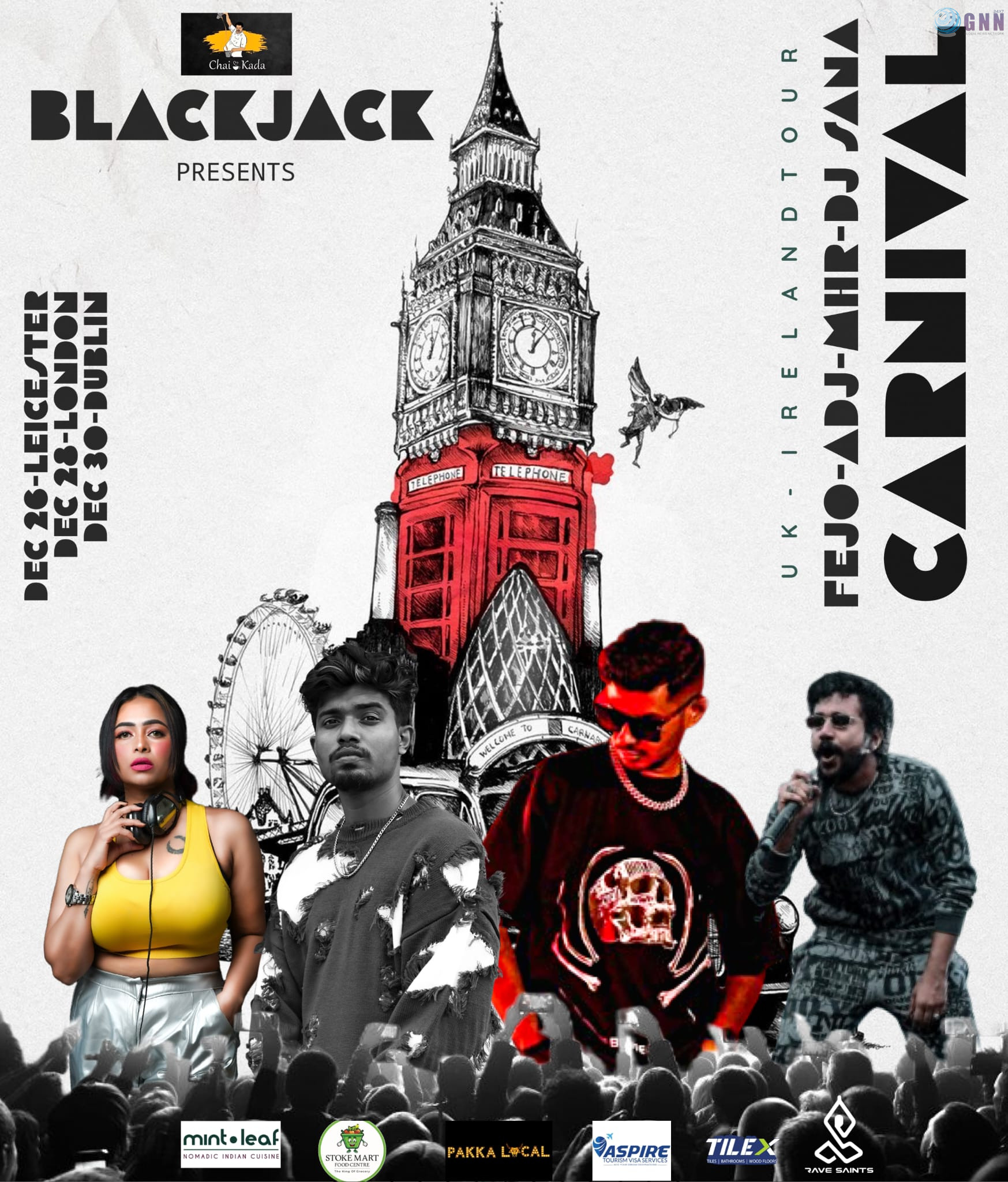 അയർലൻഡ് സംഗീതപ്രേമികൾക്ക് ക്രിസ്മസ് ന്യൂ ഇയർ ആഘോഷങ്ങൾ പവർ പാക്ക്ഡ് സംഗീതനിശ ഒരുങ്ങുന്നു. ബ്ലാക്ക് ജാക്ക് ലണ്ടൻ ലിമിറ്റഡ് ഒരുക്കുന്ന ‘CARNIVAL PARTY’ ക്ക് ഡബ്ലിൻ വേദിയാകുന്നു. നിങ്ങളുടെ പ്രിയങ്കരരായ ഫെജോയുടെ ചടുലമായ പ്രകടനങ്ങൾ, MHR DJ, സന്ന എന്നിവയുടെ ഇലക്ട്രിഫൈയിംഗ് ബീറ്റുകൾ, Adresh Adj-ൻ്റെ മാസ്മര ആലാപനം എന്നിവ ഒത്തുചേരുന്ന ഈ അവിസ്മരണീയ സംഗീത പരിപാടിയിൽ നിങ്ങൾക്കും ഭാഗമാകാം. ഡിസംബർ 30ന് ഡബ്ലിനിൽ BUTTON FACTORY ൽ നടക്കുന്ന സംഗീത പരിപാടിയുടെ ടിക്കറ്റുകൾ ഇപ്പോൾ തന്നെ ബുക്ക് ചെയ്യാം.