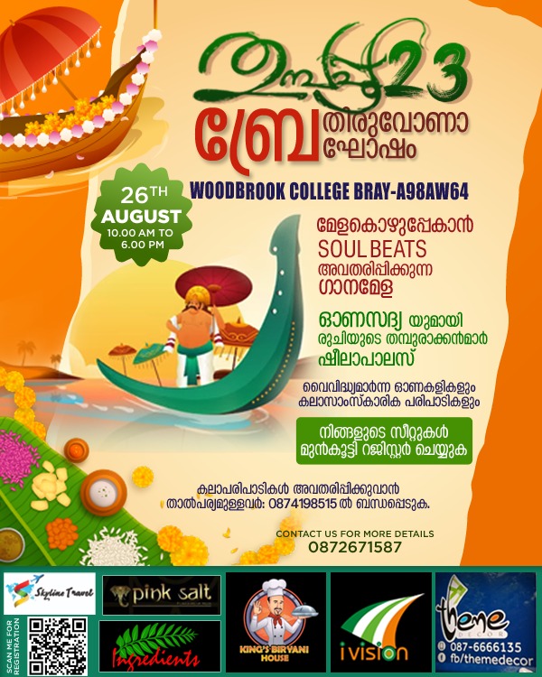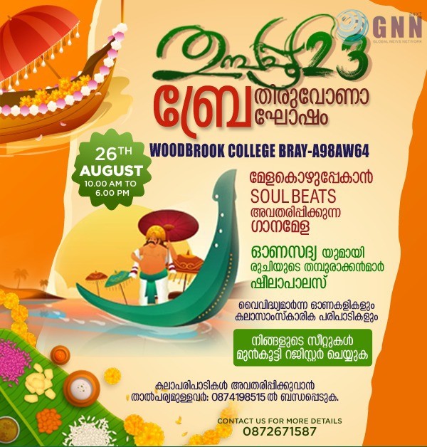 അയർലണ്ടിലുടനീളം ഓണാഘോഷം കൊട്ടികയറുമ്പോൾ, ബ്രേ മലയാളികളും ആഘോഷതിമിർപ്പിലാണ്. ആവേശം നിറയുന്ന ബ്രേ തിരുവോണാഘോഷം- “തുമ്പപ്പൂ 23” ആഗസ്റ്റ് 26, ശനിയാഴ്ച നടക്കും. WOODBROOK COLLEGE, BRAY യിൽ രാവിലെ 10 മണി മുതൽ വൈകീട്ട് 6 മണി വരെയാണ് ആഘോഷപരിപാടികൾ സംഘടിപ്പിക്കുന്നത്.