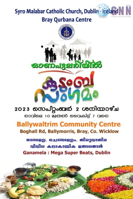 SMC ബ്രേ പിതൃവേദിയുടെ നേതൃത്വത്തിൽ നടക്കുന്ന ഓണപ്പുലരി കുടുംബ സംഗമ മാമാങ്കം സെപ്റ്റംബർ രണ്ടിന് Ballywaltrim Community Centre, Boghall Road, Bray (കമ്മ്യൂണിറ്റി സെന്ററിൽ വച്ച്) രാവിലെ 10 മണി മുതൽ വൈകുന്നേരം (10-7) ഏഴുമണിവരെ വിപുലമായ പരിപാടികളോട് SMC Ireland നാഷണൽ കോഡിനേറ്റർ ജോസഫ് ഓലിയക്കാട്ടിൽ അച്ൻറെ സാന്നിധ്യത്തിൽ നടത്തപ്പെടുന്നതാണ്.