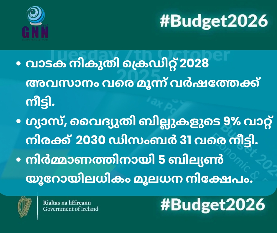 ധനകാര്യ മന്ത്രി Paschal Donohoe 2026 ലെ ബജറ്റ് അവതരണം ആരംഭിച്ചു. കോർപ്പറേറ്റ് നികുതി വരുമാനത്തെ അമിതമായി ആശ്രയിക്കുന്നത് ഒരു അപകടമാണെന്ന് സർക്കാരിന് അറിയാമെന്ന് പാസ്ചൽ ഡോണോഹോ പറഞ്ഞു. 9.4 ബില്യൺ യൂറോയുടെ ബജറ്റ് പാക്കേജിൽ 8.1 ബില്യൺ യൂറോ പൊതുചെലവിനായി നീക്കിവയ്ക്കുമെന്നും 1.3 ബില്യൺ യൂറോ നികുതിക്കായി നീക്കിവയ്ക്കുമെന്നും അദ്ദേഹം അറിയിച്ചു.