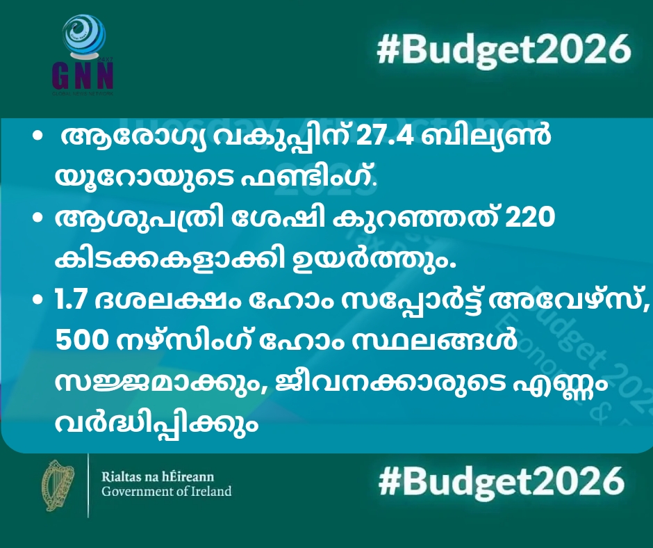 - 2026-ൽ ആരോഗ്യ വകുപ്പിന് 27.4 ബില്യൺ യൂറോയുടെ റെക്കോർഡ് മൊത്തം ഫണ്ടിംഗ് അനുവദിക്കും. ആശുപത്രി ശേഷി കുറഞ്ഞത് 220 കിടക്കകളാക്കി ഉയർത്തുന്നതിനും രോഗനിർണയ സേവനങ്ങളുടെ വിപുലീകരണത്തിനും, കുറഞ്ഞത് 280 കമ്മ്യൂണിറ്റി കിടക്കകൾ, കമ്മ്യൂണിറ്റി നഴ്സിംഗ് യൂണിറ്റുകളുടെ നവീകരണ പരിപാടിയിൽ തുടർച്ചയായ നിക്ഷേപം, കമ്മ്യൂണിറ്റി വെയിറ്റിംഗ് ലിസ്റ്റുകൾ കുറയ്ക്കുന്നതിനും ഈ നിക്ഷേപം ഉപയോഗിക്കും.