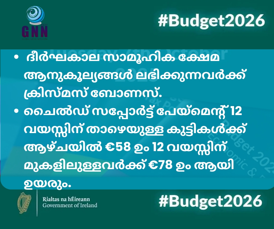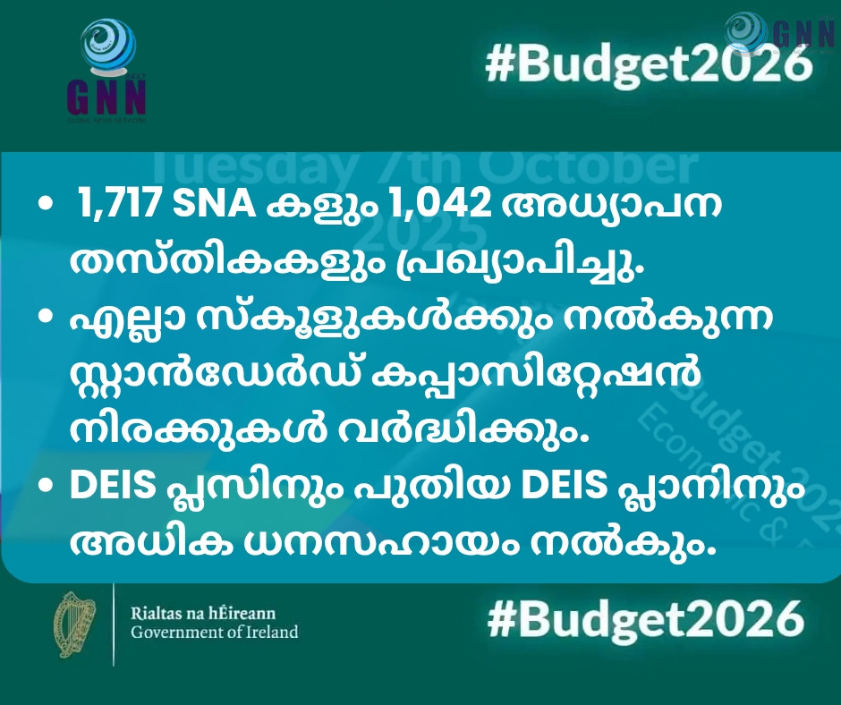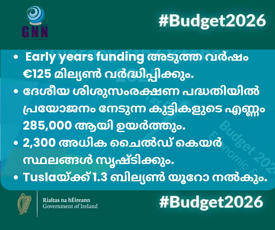 - Early years funding നുള്ള സർക്കാർ ധനസഹായം അടുത്ത വർഷം €125 മില്യൺ വർദ്ധിച്ച് €1.5 ബില്യൺ ആക്കും.