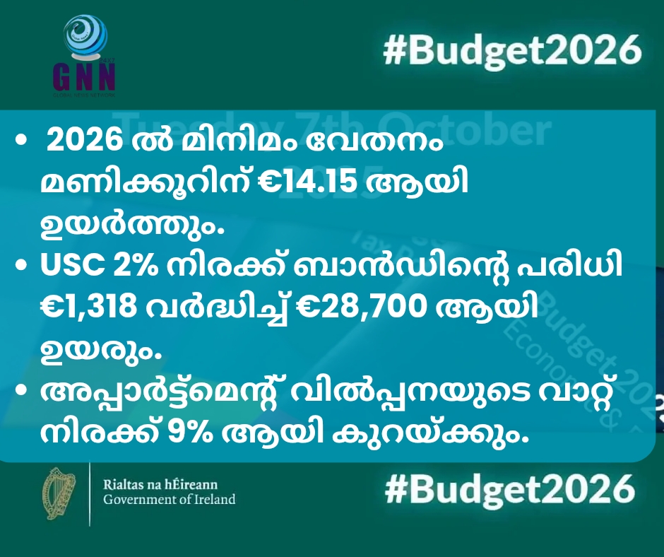 - 2026 ജനുവരി 1 മുതൽ ദേശീയ മിനിമം വേതനം മണിക്കൂറിന് €0.65 വർദ്ധിച്ച് €14.15 ആയി ഉയർത്തും.