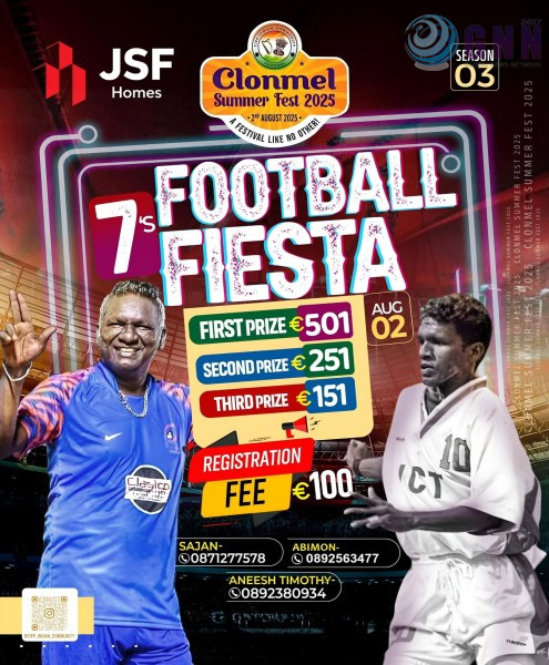 Clonmel TIPP ഇന്ത്യൻ കമ്മ്യൂണിറ്റി സംഘടിപ്പിക്കുന്ന മൂന്നാമത് ‘Clonmel Summer Fest 2025’ ഓഗസ്റ്റ് 2ന്. ഫെസ്റ്റിന്റെ പ്രധാന ആകർഷണവും, ഫുട്ബോൾ പ്രേമികളുടെ ആവേശവുമാകാൻ ‘ 7’s FOOTBALL FIESTA‘ യും നടക്കും. ഇന്ത്യന്‍ ഫുട്‌ബോള്‍ ഇതിഹാസം മലയാളികളുടെ സ്വന്തം ഐ. എം. വിജയൻ മത്സരത്തിന്റെ കിക്ക് ഓഫ് നിർവ്വഹിക്കും. വിജയികൾക്ക് 501യൂറോ ക്യാഷ് അവാർഡ് സമ്മാനമായി ലഭിക്കും.