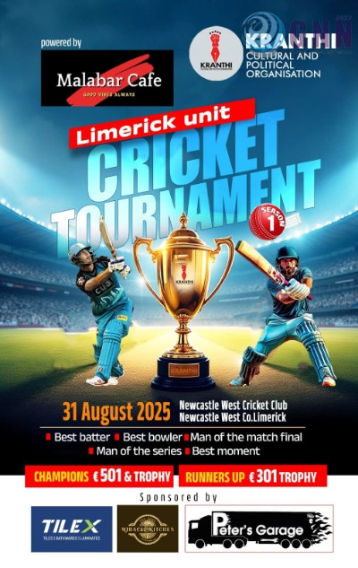 ലിമറിക്: അയർലണ്ടിലെ ക്രിക്കറ്റ് പ്രേമികൾക്ക് ആവേശം പകരാൻ ക്രാന്തി ലിമറിക് യൂണിറ്റിന്റെ ആഭിമുഖ്യത്തിൽ ക്രിക്കറ്റ് ടൂർണമെൻറ് സംഘടിപ്പിക്കുന്നു. ഓഗസ്റ്റ് 31ന് ന്യൂ കാസിൽ വെസ്റ്റ് ക്രിക്കറ്റ് ക്ലബ്ബ് ഗ്രൗണ്ടിലാണ് മത്സരങ്ങൾ അരങ്ങേറുന്നത്.