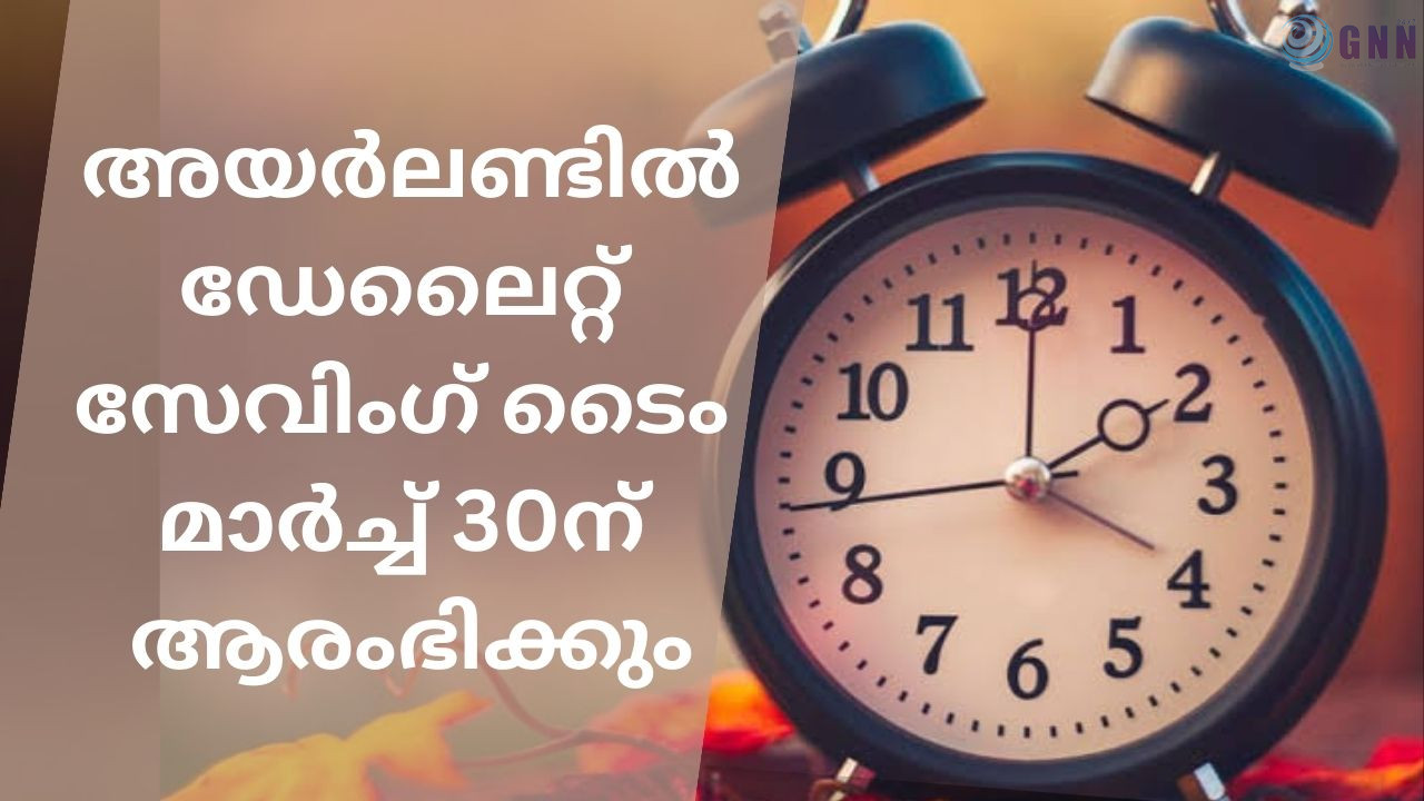 അയർലണ്ടിൽ ഡേലൈറ്റ് സേവിംഗ് ടൈം ക്രമീകരണം മാർച്ച് 30ന് ആരംഭിക്കും. 2025-ലെ ഡേലൈറ്റ് സേവിംഗ് ടൈം (DST) രാജ്യങ്ങൾക്കിടയിൽ വ്യത്യാസപ്പെടുന്നു, വേനൽക്കാലം അടുക്കുമ്പോൾ ക്ലോക്ക് മുന്നോട്ടും ശൈത്യ കാലാവസ്ഥയാകുമ്പോൾ പിന്നോട്ടും ചലിപ്പിക്കുന്ന രീതിയാണിത്. യൂറോപ്പില് വേനൽ സമയം മാര്ച്ച് 30 ന് പുലര്ച്ചെ ആരംഭിക്കും. മാര്ച്ച് മാസത്തിലെ അവസാനത്തെ ഞായറാഴ്ച പുലര്ച്ചെയാണ് ഈ സമയമാറ്റം വരുന്നത്. പുലർച്ചെ 2:00 ന്, ക്ലോക്കുകളിലെ സമയം ഒരു മണിക്കൂർ മുന്നിലേക്ക് മാറ്റി 2:00 മണിയാക്കുന്നതോടുകൂടി സമയമാറ്റ പ്രക്രിയ പൂർത്തിയാവും.