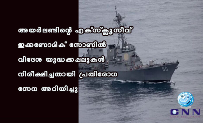 അയർലണ്ട്: ഈ ആഴ്ച അയർലണ്ടിന്റെ എക്സ്ക്ലൂസീവ് ഇക്കണോമിക് സോണിന് (ഇഇസെഡ്) പുറത്തും അകത്തും നിരവധി വിദേശ യുദ്ധക്കപ്പലുകൾ നിരീക്ഷിച്ചതായി പ്രതിരോധ സേന അറിയിച്ചു.