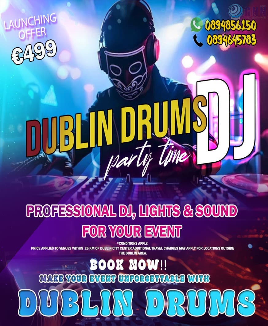 ഒത്തുചേരലുകളും ആഘോഷരാവുകളിലും ഇനി മുതൽ ത്രസിപ്പിക്കുന്ന സംഗീതാനുഭവം അകമ്പടിയാക്കാം. ആവേശം നിറഞ്ഞ സംഗീത്തിന് ചുവടുപിടിക്കാൻ DUBLIN DRUMS DJ നിങ്ങൾക്ക് മുന്നിലേക്ക്. ആസ്വാദക ഹൃദയം കവരാൻ സംഗീത വിസ്മയത്തോടൊപ്പം ഇനി വർണ്ണ വിസ്മയയും ഒരുങ്ങുന്നു. പ്രൊഫഷണൽ ഡിജെ യോടൊപ്പം ആഘോഷങ്ങൾക്ക് മിഴിവേകാൻ ലൈറ്റ്സ് ആന്റ് സൗണ്ട് സംവിധാനങ്ങളും തയ്യാർ. ലോഞ്ചിംഗ് ഓഫറായ 499 യൂറോയ്ക്ക് ഇപ്പോൾ തന്നെ ബുക്ക് ചെയ്യാം. ഡബ്ലിൻ സിറ്റി സെൻ്ററിൻ്റെ 25 കിലോമീറ്റർ ചുറ്റളവിലുള്ള വേദികൾക്ക് ഈ ഓഫർ ലഭ്യമാണ്.ഡബ്ലിൻ ഏരിയയ്ക്ക് പുറത്തുള്ള സ്ഥലങ്ങൾക്ക് മാത്രം അധിക യാത്രാനിരക്കുകൾ ബാധകമാകുകയുള്ളു.