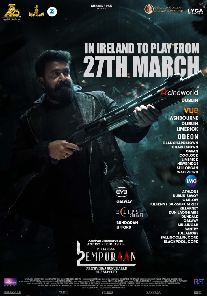 മോഹൻലാലിൻറെ ഏറ്റവും പുതിയ ചിത്രമായ എമ്പുരാൻ അയർലൻഡിൽ മാർച്ച് 27ന് റിലീസ് ചെയ്യുന്നു. പൃഥ്വിരാജ് സുകുമാരനും മുരളി ഗോപിയും ചേർന്നൊരുക്കിയ വിസ്മയം കാണാൻ സിനിമാലോകം കാത്തിരിക്കുകയാണ്.