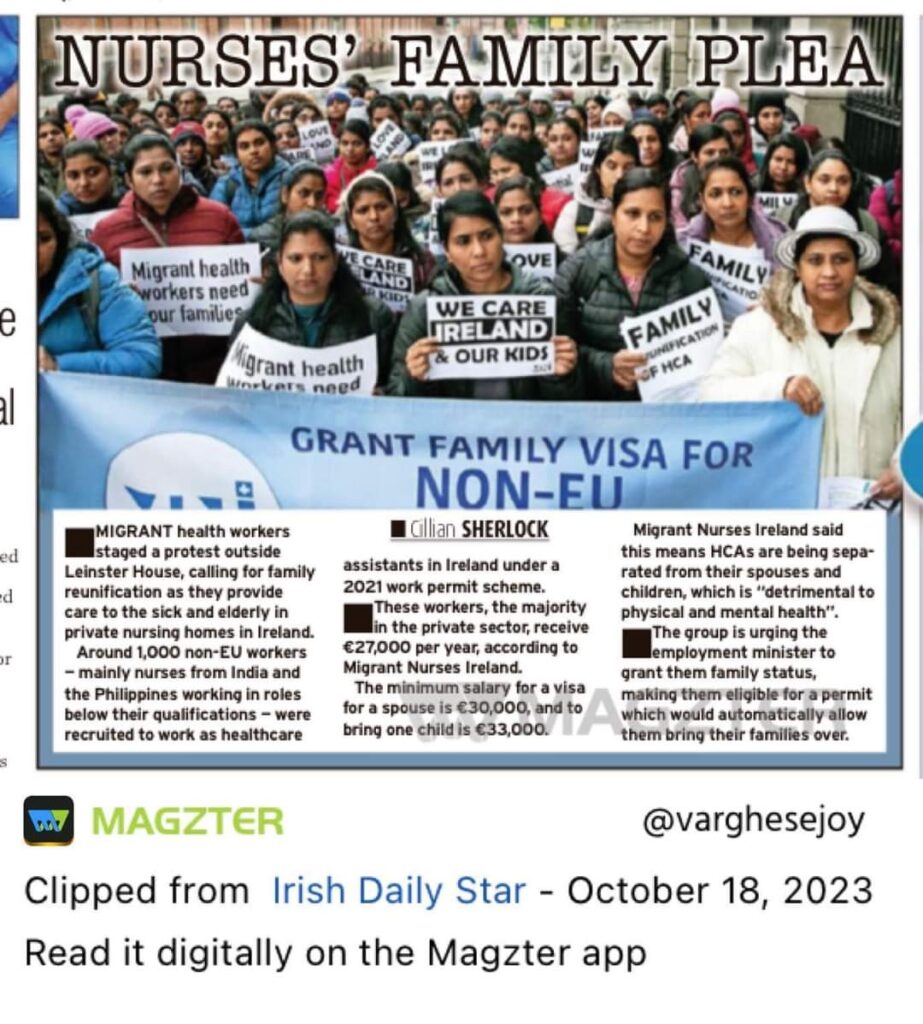 ആയിരക്കണക്കിന് പ്രവാസി കുടുംബങ്ങളുടെ ഏറെ നാളായുള്ള ആവശ്യം അക്ഷീണ പരിശ്രമത്തിലൂടെ നേടിയെടുത്തത് MNI യുടെ ഇടപെടലിലൂടെ മാത്രമാണ്. ഫാമിലി വിസ മാനദണ്ഡങ്ങളിൽ മാറ്റം ആവശ്യപ്പെട്ട് മൈഗ്രന്റ് നഴ്സസ് അയർലണ്ടിന്റെ നേതൃത്വത്തിൽ ഹെൽത്ത് കെയർ അസ്സിസ്റ്റന്റുമാർ ഐറിഷ് പാർലമെന്റിന്റെ മുന്നിൽ സംഘടിപ്പിച്ച പ്രതിഷേധം ഈ പ്രശ്നം ഭരണതലത്തിൽ ചർച്ച ചെയ്യുന്നതിന് വഴിയൊരുക്കി.